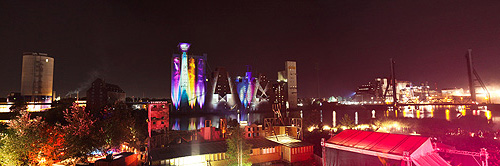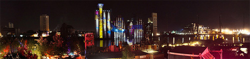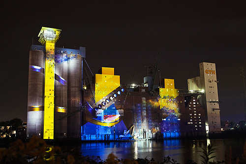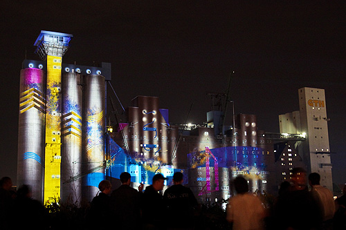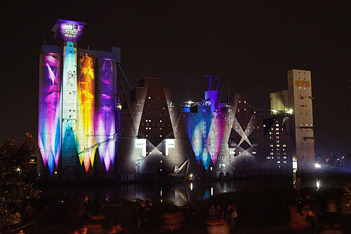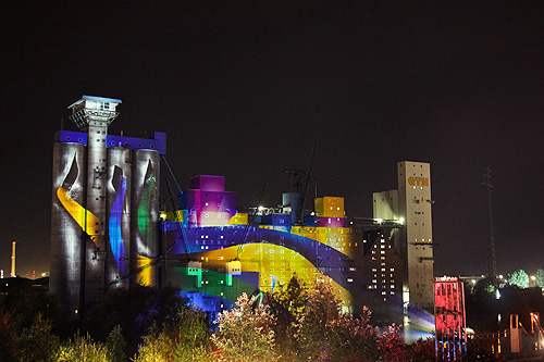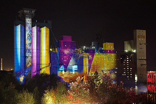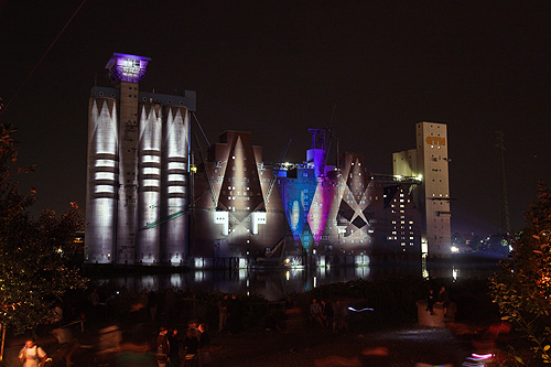 The old industrial granary complex of the "Rethe-speicher" was illuminated with large image slide projections.
