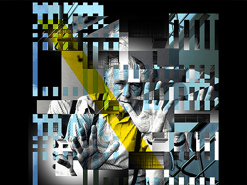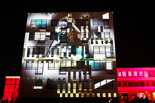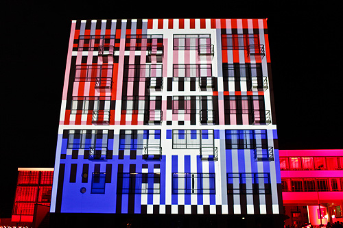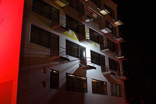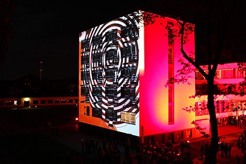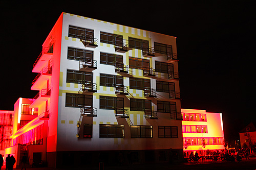 An architectural staging of the Bauhaus Prellerhaus facade in Dessau, Germany. It was performed on the 5th of september 2009 in the context of the "12. Farbfest Rot".